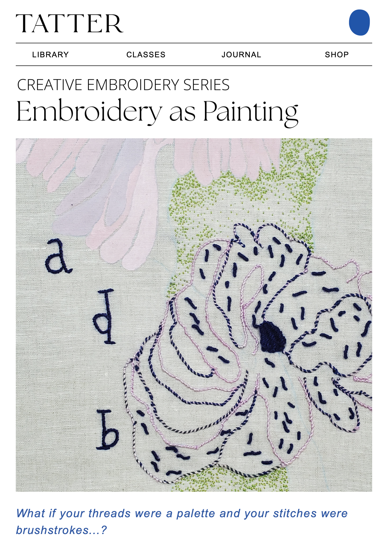 My workshop, "Embroidery as Painting," will be the first in their new Creative Embroidery series. TATTER is a beloved place for me, and I am delighted to be one of the instructors.